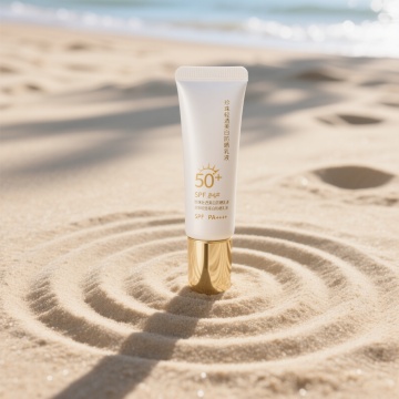 现代3D轻拟物风设计,金属质感瓶身,沙滩背景突显清爽夏日防晒创意。