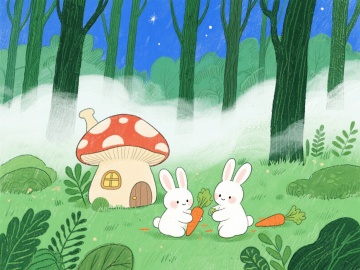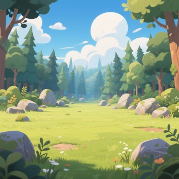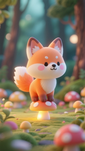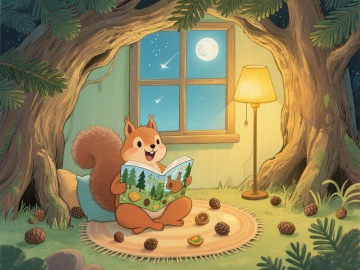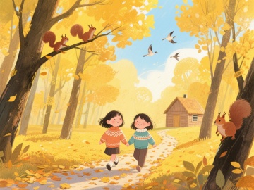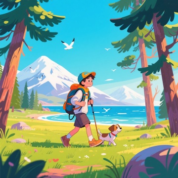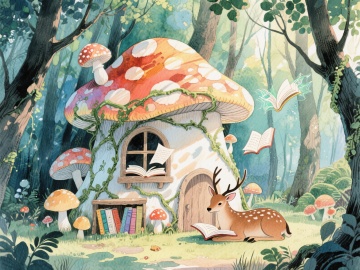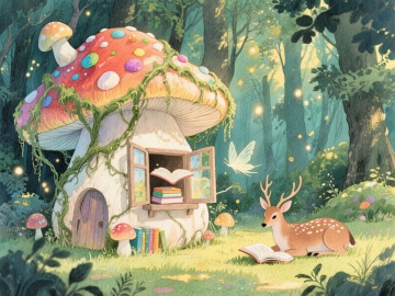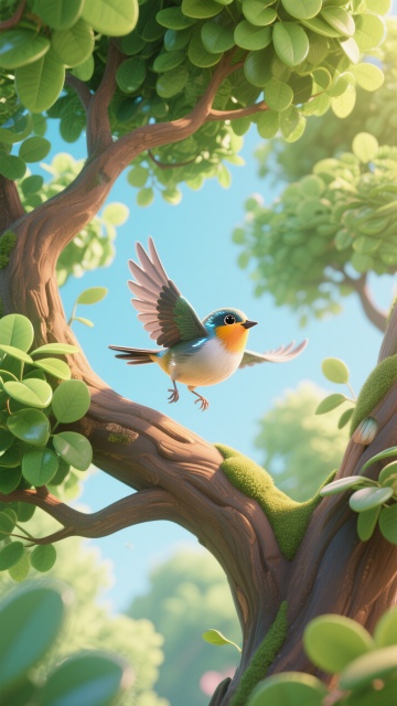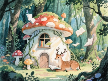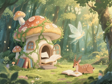 森林风格儿童书包,主体苔藓绿,正面绿色小鹿图案,鹿角点缀小花朵,加厚肩带带填充质感与调节扣,防水面料有高光和水滴滑落效果,45度角斜向摆放于林间小径中下方,占画面40%。背景为纵深林间小径,两侧卡通树木,树干粗壮,树冠云朵状,远景模糊。一只毛茸茸卡通小鹿精灵从树后探出头,好奇嗅书包,带翅膀和发光元素。阳光穿透树叶形成放射状光束与圆形光斑,底部散落动态飘落的枫叶和橡树叶,周围有1-2颗小蘑菇。低饱和森林系插画风格,线条圆润柔和,光影通透温暖,自然童趣氛围。