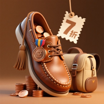 复古皮质鞋履搭配金属奖牌与金币,3D重拟物风格呈现商务质感,悬挂“7折”标签强化促销氛围,整体充满节日礼遇感。