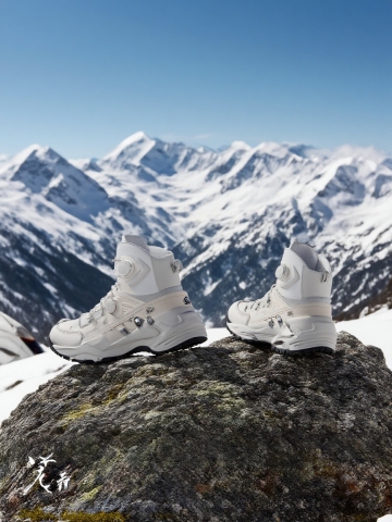 木质栈道延伸向远山,两侧绿意盎然,鞋子居中,户外休闲风。