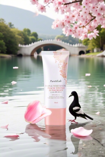 清新玻璃瓶置于虚拟自然水景中,花影轻舞,尽显清爽与清透感。