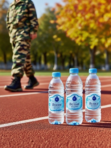 画面右侧前景呈现3个产品。背景构建秋日户外跑道场景,绿树成荫,中景穿军训迷彩服的列队学生脚部特写(适度虚化 )。风格为写实商业广告风,平视视角构图,用秋日柔和自然光营造氛围,突出产品健康、运动属性 。