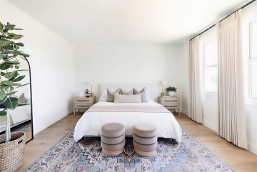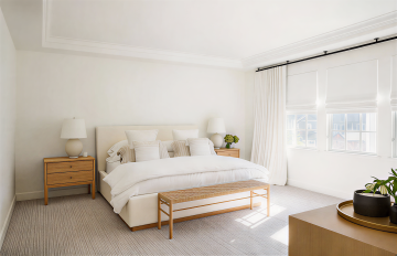 一张现代简约风格的卧室设计图,整体色调为温暖的米白色和浅木色,搭配柔和的自然光线从大窗户洒入,营造出宁静舒适的氛围。房间内有一张铺着白色条纹床单的双人床,床头摆放着简约的床头柜和台灯,床尾处铺着一张米白色的地毯。房间的另一侧是一个白色的梳妆台,上面摆放着一些绿植和装饰品。墙面采用了简约的线条设计,整体空间布局合理,家具摆放整齐有序。