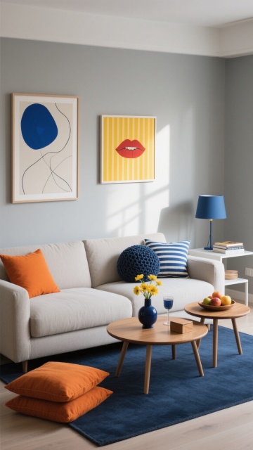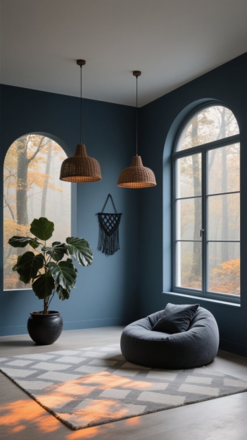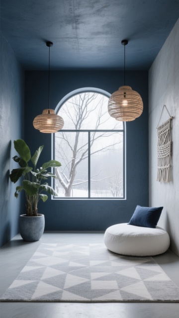 俯视角构图,极简主义风格客厅,整体以冷灰色、深靛蓝和哑光黑为主色调,营造出冷静克制的未来感氛围。傍晚时分,右侧墙面的悬浮式几何窗格精准切割着渐暗的天光,在深灰色微水泥地面投射出规则的菱形阴影图案。房间中央是一个模块化的深靛蓝色布艺转角沙发,表面呈现细腻的纹理褶皱,沙发上随意摆放着两个同色系但不同材质的靠垫——一个光滑如丝,一个粗粝似麻。沙发前是一块超大尺寸的浅灰色羊毛地毯,边缘故意做旧处理,地毯中央悬浮着一个由哑光黑金属框架支撑的透明亚克力茶几,茶几上放置着一个极简线条的黑色陶瓷花瓶,里面插着三支干枯的黑色芦苇。沙发左侧墙角矗立着一盆形态遒劲的琴叶榕,深绿色叶片在冷光下呈现出近乎黑色的剪影,种植在一个带有细微凹痕的手工浇筑混凝土花盆中。沙发背景墙采用了深浅不一的灰色渐变处理,中央悬挂着一幅无框的几何抽象画,画面由精确的黑色直线和大小不一的白色方块构成,画作下方是一个悬浮式的黑色橡木电视柜,表面只放置了一个造型极简的白色音响。天花板采用无主灯设计,而是在不同区域嵌入了可调节角度的线性LED灯带,光线均匀地漫射在整个空间,强调出墙面的微妙肌理和家具的利落线条。地面采用600×600mm的深灰色哑光瓷砖,以30度角错位拼接,缝隙间填充同色系美缝剂,形成整体感极强的视觉平面。整个空间布局遵循"少即是多"的原则,每一件家具都经过精心挑选,线条锐利如刀锋,光影层次分明,呈现出一种冷静而富有力量的空间美学。