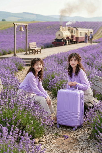清新简约风格,实景校园背景,两人携手前行,行李箱点缀,青春气息浓厚。