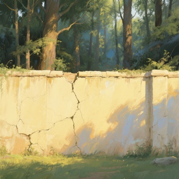 卡通游戏风格,正面视角,整个画面充满浅黄色土墙,墙面上有轻微的裂缝,表面干净整洁,背景体现森林的宁静感,无其他多余元素,数码厚涂质感,笔触厚重