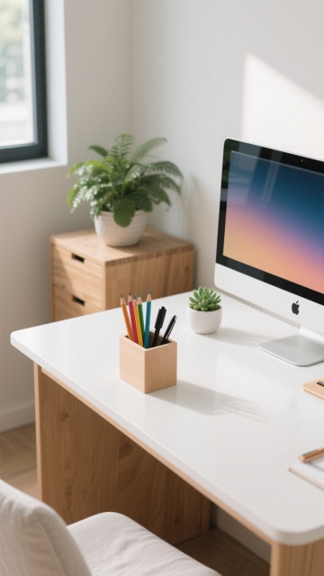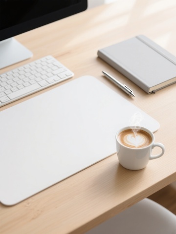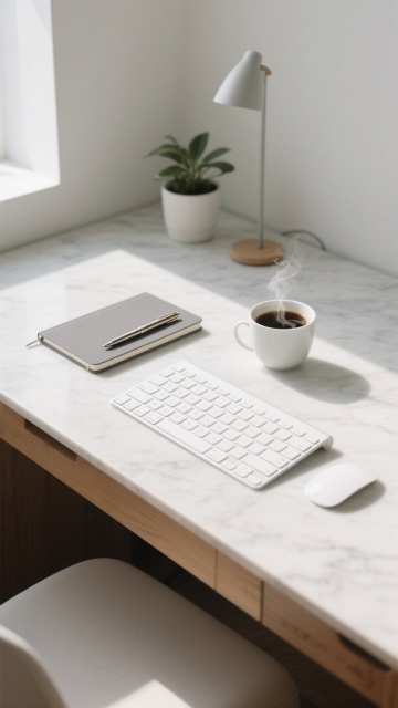 现代化的办公场景,明亮的光线透过落地窗洒入,整洁的办公桌,笔记本电脑打开着,旁边放着一杯冒着热气的咖啡,绿植点缀其间,墙上挂着简约的装饰画,整体氛围专业而舒适