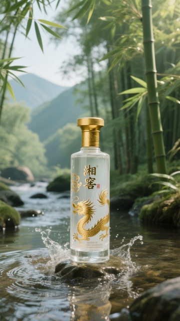 一个透明玻璃瓶身的湘窖酒,瓶身上有金色龙纹图案和“湘窖”字样,瓶盖为金色,瓶身立于清澈的溪流中,溪水泛起涟漪和水花,周围是茂密的竹林,竹叶青翠,阳光透过竹叶洒下斑驳光影,背景为朦胧的远山,整体呈现出自然、雅致的氛围,光线柔和,具有高质感和清晰的细节,色彩以金色、透明色和自然的绿色为主,构图平衡,突出酒瓶主体。