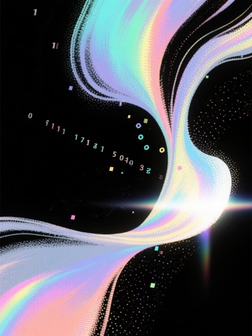 白色背景上,由不同形态的科技感线条构成的抽象图案,包含波浪状曲线、垂直直线和点状点阵,线条颜色变换为蓝色、青色、紫色等多种渐变色彩,整体呈现出流动感和未来感,线条细腻流畅,色彩过渡自然和谐,充满现代科技美学气息。