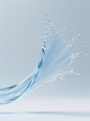 超写实风格的水元素特写,清澈透明的蓝色水层占据画面下半部分,上方为纯净白色背景,水面呈现富有动感的波浪造型,浪花翻卷处溅起细碎水珠与大小不一的气泡,光线从左上方柔和射入水中形成渐变光影效果,整体营造出清新、宁静且充满生命力的氛围。