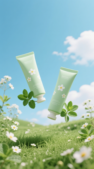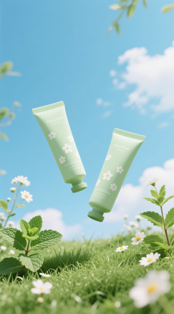 清新绿意跃动,3D风与软3D质感交织,金属光泽收纳包悬浮释放自然元素,粒子飘散营造虚实交融的未来感,传递舒适、科技与时尚共生的护肤新体验。