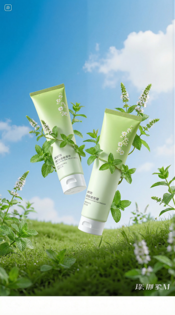 清新绿意背景,简约设计,展现自然清爽感,传递夏日护肤理念。