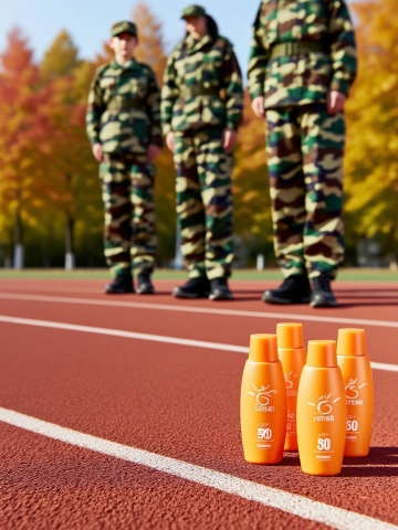 实景感跑道,清新秋景,热血军训,现代防晒霜设计,扁平风标签,微缩艺术风呈现。