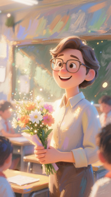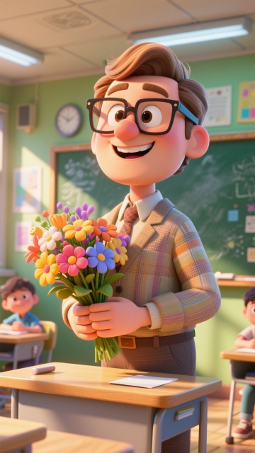 午后的教室里,金色阳光如碎金般洒落,一位戴着眼镜、面带温柔笑意的老师,正开心地捧着学生送来的色彩缤纷的花束;以暖色调呈现,打造皮克斯风格的 3D 角色,同时融入温馨的教室元素(如整齐的课桌椅、隐约可见的黑板、周围是学生),整体氛围温暖治愈,凸显师生间的美好互动。