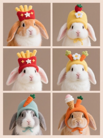一系列规整排列的六只可爱卡通小兔子,每只兔子都有不同的动作姿态,包括趴着、坐着、双手抱脸、歪头等,保持原有的Q版日系动漫风格,白色绒毛质感,粉红色内耳和脸颊红晕,黑色圆眼睛,简洁的线条勾勒,白色背景,整体呈现出可爱治愈的氛围,动作多样且排列整齐有序。