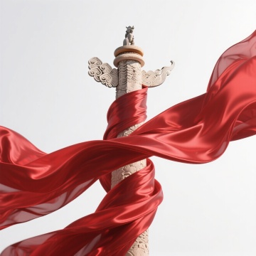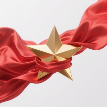 红色飘扬的绸缎缠绕着金色的星星(五边形,五个角),白色背景