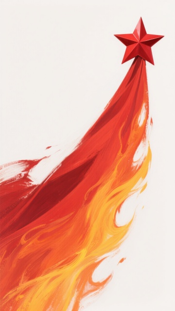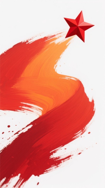 党建主题海报,顶部偏右侧位置有一颗立体红色五角星,下方是大面积红色与橙色渐变的抽象笔触,色彩从深红过渡到亮橙,笔触具有明显的油画质感,边缘有自然的飞溅效果,整体营造出庄重、热烈、积极向上的氛围,画面简洁大气,视觉焦点突出,背景为纯白色,无文字和其他装饰元素。