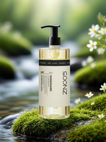 清新自然的溪流实景中,透明玻璃瓶身搭配极简标签,融合轻拟物与性冷淡风设计,营造出清透、静谧的视觉体验,传递舒缓与纯净的使用感受。