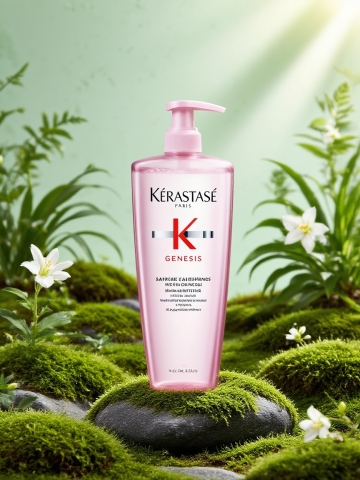 清新玻璃瓶置于虚拟自然水景中,花影轻舞,尽显清爽与清透感。