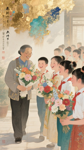 古典中式工笔风,水墨山水背景,唯美感教师节场景,文艺气息浓厚。