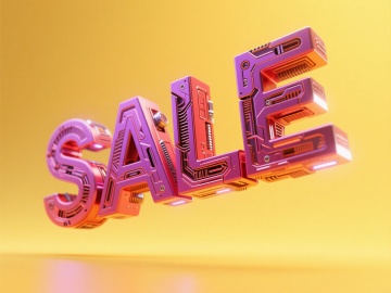 一个蓝紫色渐变金属质感的购物车,车身有几何切割棱角,车轮是透明亚克力材质带彩色光晕,车内装满透明水晶礼盒、发光霓虹色“SALE”标牌和漂浮的全息货币符号,背景是赛博朋克风格的霓虹网格,点缀着破碎的几何星星和六边形光斑,整体呈现未来科技感的电商促销氛围,高对比度光影,光滑反光材质,立体感强。