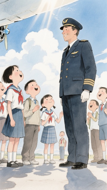 蓝天白云,高中生们(穿着中国校服,姿态不一)愉悦站在一位机长身边,