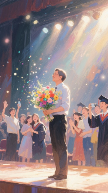 梦幻感插画风,水彩渲染毕业典礼,鲜花与掌声交织,温馨庆祝时刻。