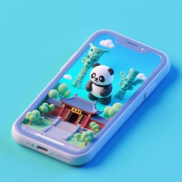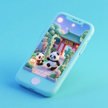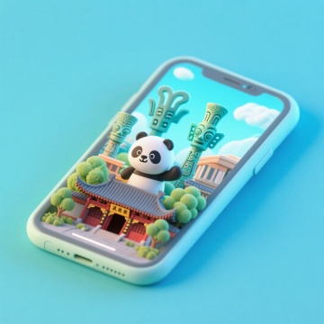 软3D风格手机屏中,萌趣熊猫跃出屏幕,中式古建筑与青铜器环绕,梦幻光影交织,融合可爱、卡通与科技感,呈现微缩艺术之美。