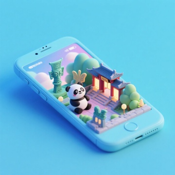 软3D风格手机微缩场景,熊猫与古蜀元素萌趣互动,清新梦幻,卡通感十足,呈现成都文化虚拟现实体验。