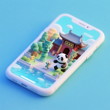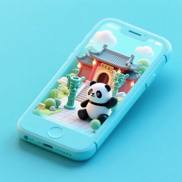 软3D风格手机微缩场景,可爱熊猫立于古风建筑前,融合粘土质感与清新配色,卡通感十足,呈现趣味国潮视觉。
