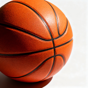 一个高度写实的篮球,呈现出经典的橙色皮质纹理,表面布满细密的小颗粒状凹凸质感,黑色的橡胶条将球面分割成标准的八块闭合区域,线条边缘清晰且略微凸起,球体在纯白色背景下居中放置,光线从左上方柔和照射,在球体右侧形成自然的渐变阴影,展现出饱满的立体感和真实的材质光泽,整体画面简洁干净,突出篮球的形态美与细节质感。