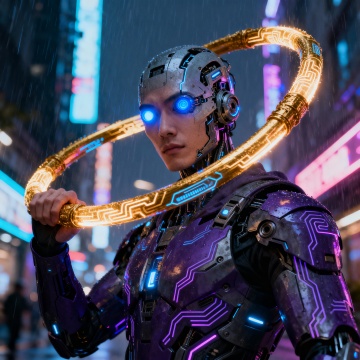 赛博朋克风3D角色,未来感科技金属设计,霓虹灯照亮夜景,展现冷酷与力量。