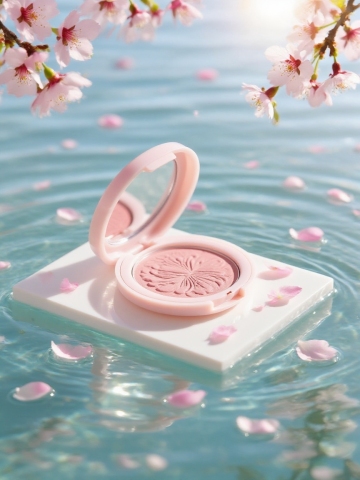 顶级静物摄影,一个精致的粉色腮红盒打开放在一片平静的水面上,水面漂浮着几片新鲜的玫瑰花瓣,并完美倒映出产品与天空,背景是虚无的黑暗,一束顶光照亮主体,神秘而高级,空间感深邃。
