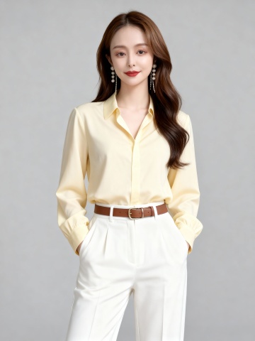 小清新嫩黄色衬衫,模特表情为甜美微笑,整体风格统一,清新自然