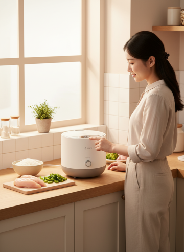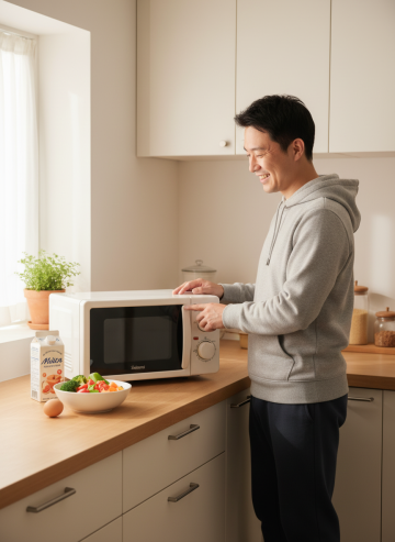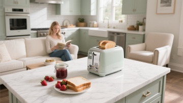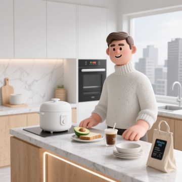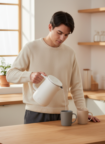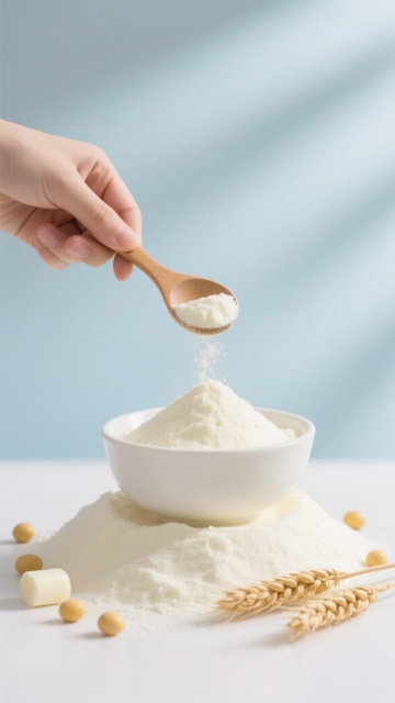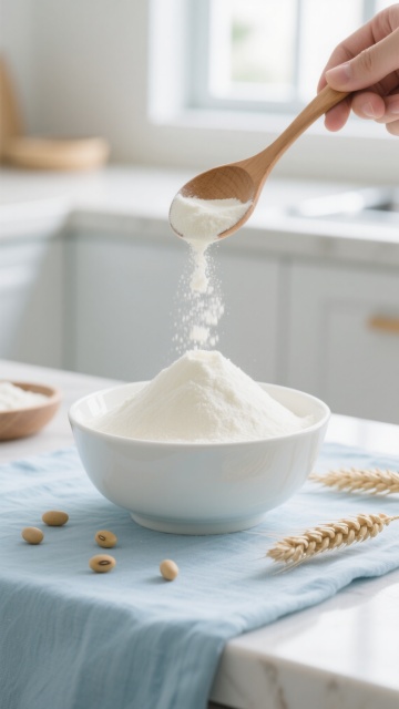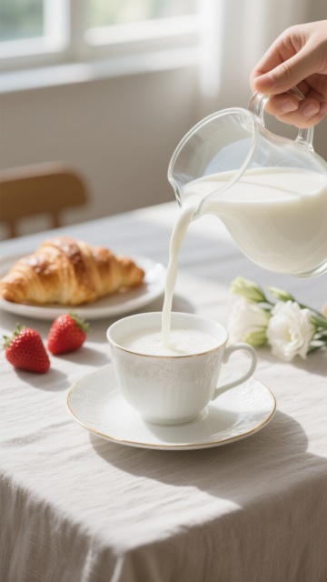 一张温馨生活风格的早餐场景特写照片,晨光从左侧窗户柔和洒落,在白色瓷杯和奶壶上形成细腻的高光与阴影,透明玻璃奶壶正将乳白色的牛奶以优美的弧线缓缓倒入下方带有精致花纹的白色瓷杯,杯口泛起细密的奶泡,牛奶流动的瞬间清晰可见。前景中,白色瓷杯置于配套的白色碟子上,碟子边缘有简约的描金装饰。背景更换为铺着浅灰色亚麻桌布的餐桌,上面摆放着新鲜出炉的金黄色牛角面包、几颗鲜红饱满的草莓和一小束淡雅的白色洋桔梗,整体色调以白色、米色、浅灰为主,点缀着食物的自然色彩,营造出宁静、舒适、充满生活气息的早晨氛围,画面构图采用经典的三分法,焦点集中在牛奶倒入杯中的动态瞬间,背景元素模糊处理以突出主体,光影柔和自然,呈现出温暖治愈的居家感觉。
