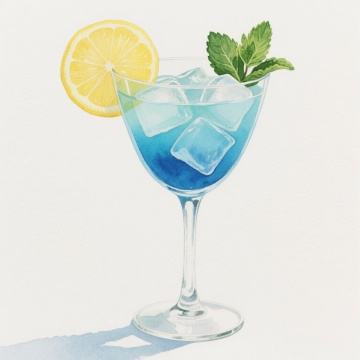一张冰镇饮料插画,卡通风格,玻璃质感,整体色彩为清爽蓝色,杯子里装有柠檬片和冰块,背景为纯蓝色,所有元素规整排布,高光和阴影处理一致,杯身有菱形格纹设计,展现清爽透明的视觉效果