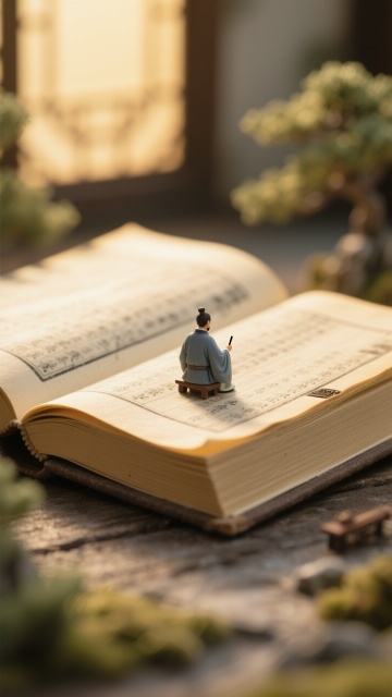 古典中式微缩艺术,工笔细腻描绘,水墨淡雅,书卷之上,文人雅士静读,尽显古韵。
