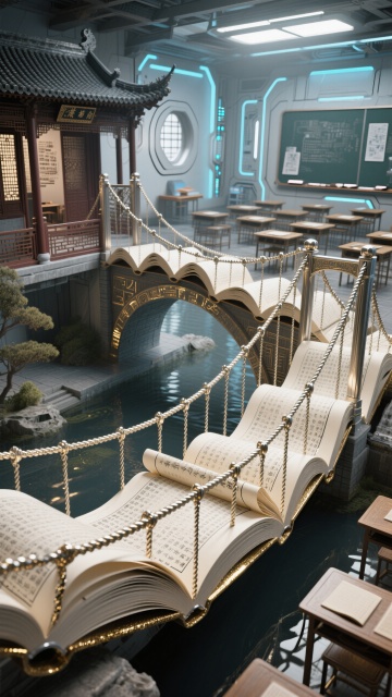 中式古典与未来科技交融,3D超现实主义设计,金属鎏金风书桥,营造梦幻学习空间。