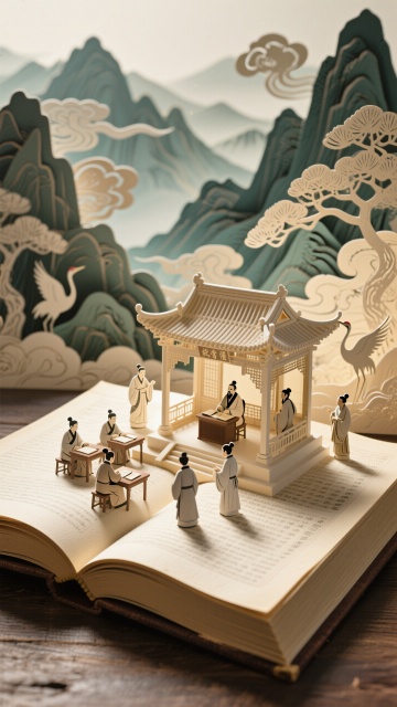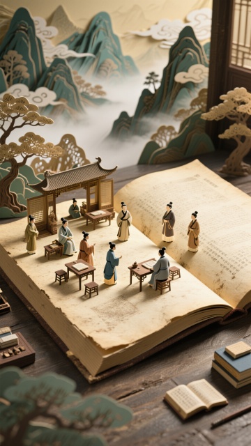 古典中式插画风,微缩艺术展现古代书院场景,水墨与撕纸结合,营造浓厚文化氛围。
