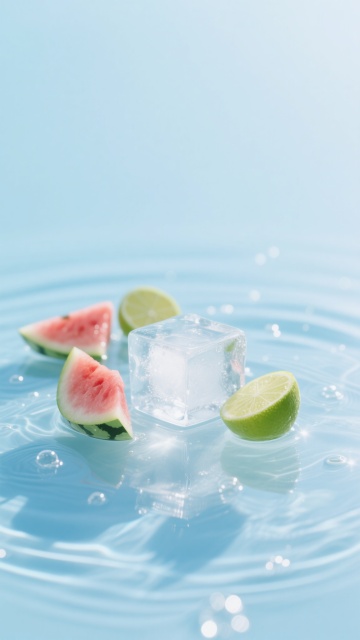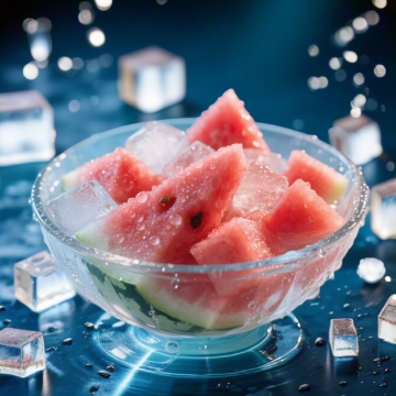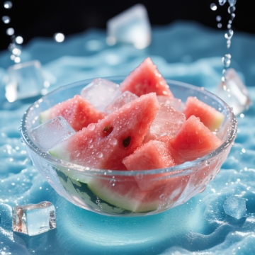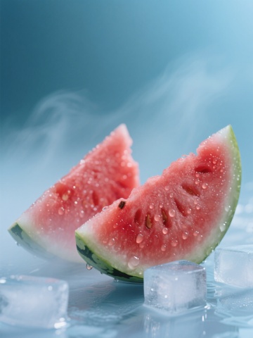高清商业摄影风格,翠绿圆润的西瓜,部分切半的西瓜鲜红,部分散落,表面磨砂并附着水珠,与透明立方体冰块一同悬浮在柔和渐变的红色背景中,动态飞溅的水花及大量圆润水珠散布画面,光线从上方柔和照射,形成西瓜和冰块表面的高光与细腻阴影,整体营造出清凉、新鲜、富有活力的氛围,画面干净通透,色彩和谐统一,具有强烈的视觉冲击力和质感表现