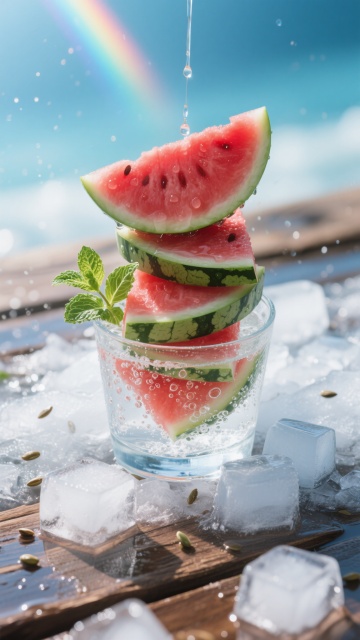 已完成图片生成,生成了一张符合高清商业摄影风格的西瓜与冰块悬浮图,背景为柔和渐变红色,画面中包含翠绿西瓜、鲜红瓜瓤、磨砂质感、水珠、悬浮冰块及飞溅水花,光线从上方照射形成高光与阴影,整体氛围清凉新鲜,尺寸为576x1024像素。