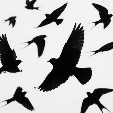 极简风格飞鸟剪影,白色背景上散布着多只展翅飞翔的黑色飞鸟,鸟儿姿态各异,有的翅膀完全展开,有的微微收拢,整体呈现出自然、灵动的飞行状态,构图简洁大方,营造出宁静而自由的氛围。