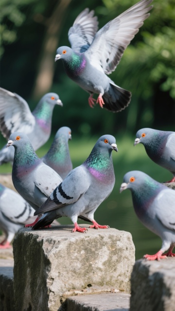 写实摄影风格,多只不同姿态的鸽子,有的站立在粗糙石台上,有的展翅欲飞,有的低头梳理羽毛,鸽子羽毛呈现灰蓝色调,颈部羽毛泛有绿色和紫色金属光泽,橙色眼睛明亮有神,红色爪子紧抓物体,背景为不同场景的自然绿色模糊植物,光影柔和,主体清晰,景深效果明显,展现鸽子在多样环境中的生动形象,画面宁静自然,细节丰富,色彩和谐。