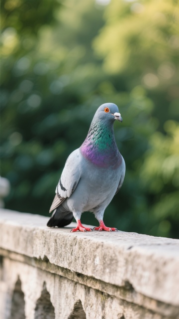 一只羽毛呈蓝灰色并带有绿色和紫色光泽颈部的鸽子,站立在粗糙质感的石制边缘上,红色的爪子清晰可见,橙色的眼睛明亮有神,背景是模糊的绿色自然植物,营造出宁静的户外氛围,采用写实摄影风格,浅景深突出主体鸽子,光线柔和自然,展现不同场景和造型的鸽子在类似自然背景中的生动姿态