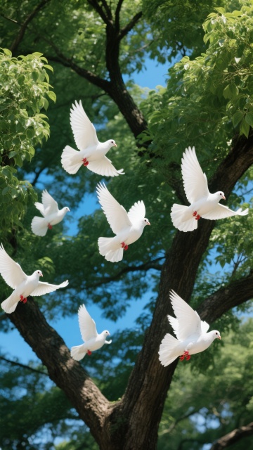 写实风格摄影,画面中多只洁白的飞鸟(鸽子)在茂密的绿树间自由飞翔,白色羽毛在阳光下泛着柔和光泽,红色的脚爪清晰可见,飞鸟姿态各异,有的展翅高飞,有的滑翔穿梭;背景是枝叶繁茂的树木,深绿色的叶片层次丰富,粗壮的树干纹理清晰,透过枝叶的缝隙可见明亮的蓝色天空,光影效果自然,阳光透过树叶形成斑驳的光影洒在飞鸟和枝叶上,整体氛围宁静而充满生机,构图饱满,飞鸟与绿树形成鲜明的色彩对比,展现出自然和谐的美好景象。