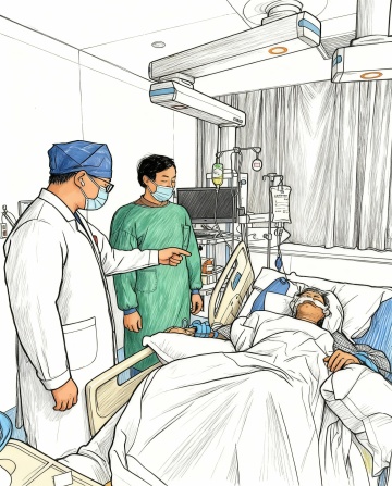 两位穿着白色医生制服、佩戴听诊器的医生,双臂交叉站立在医院走廊中,背景为明亮模糊的医院环境,采用极简主义风格,扁平化设计,低饱和度色调,线条简洁流畅,几何色块构成,无渐变光影,清晰的轮廓线,简约的构图,注重空间感和物体形态的纯粹表达,整体画面干净利落,传达专业、冷静、有序的医疗氛围。
