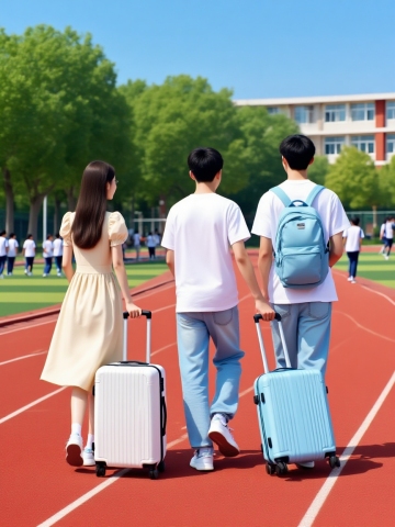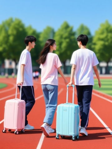 背向画面的两位活力大学生走在红色校园跑道上。女生穿浅米色连衣裙,旁有白色拉杆箱(上放书包);男生着白半袖、浅蓝牛仔裤、背着书包,拉浅蓝拉杆箱。背景蓝天绿树、操场,远处教学楼与模糊大学生隐约可见,写实清新,色调明亮,满是青春愉悦。