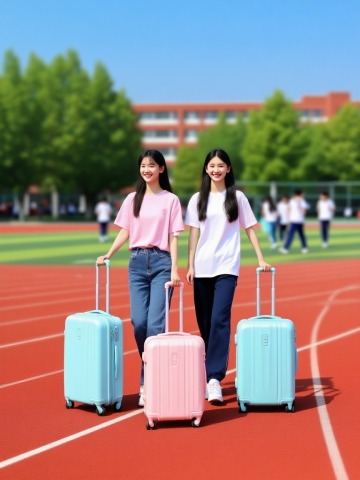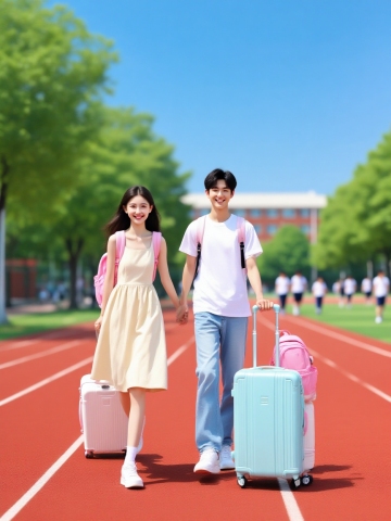 清新简约风格,实景校园背景,两人携手前行,行李箱点缀,青春气息浓厚。