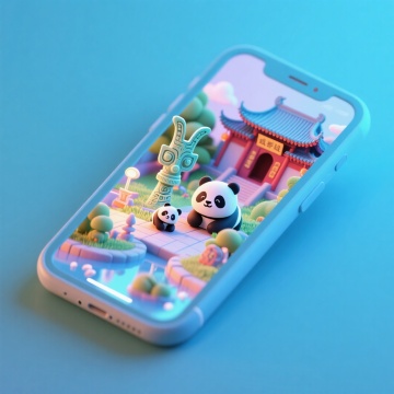 软3D风微缩艺术,可爱熊猫跃出手机屏,融合三星堆与古建筑,清新梦幻的卡通场景,传递传统文化趣味。