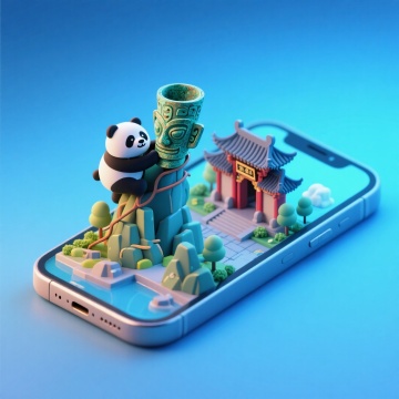 软3D风微缩艺术,熊猫与中式建筑在手机屏中萌趣互动,粘土质感融合卡通元素,展现东方美学与科技的可爱碰撞。